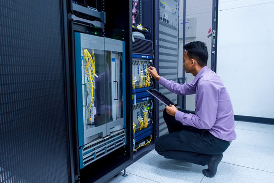 Network administrator with tablet computer in hand working with networking switch in data center room