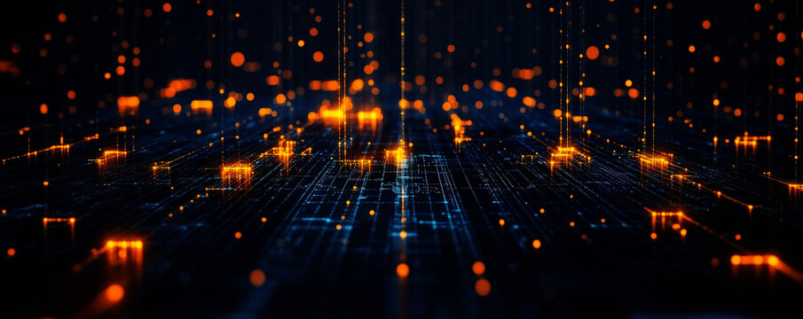 Futuristic digital circuit board with glowing blue and orange lights