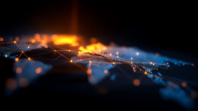 Abstract digital network visualization with glowing orange and blue nodes connected by lines, representing data flow or technology on a dark background