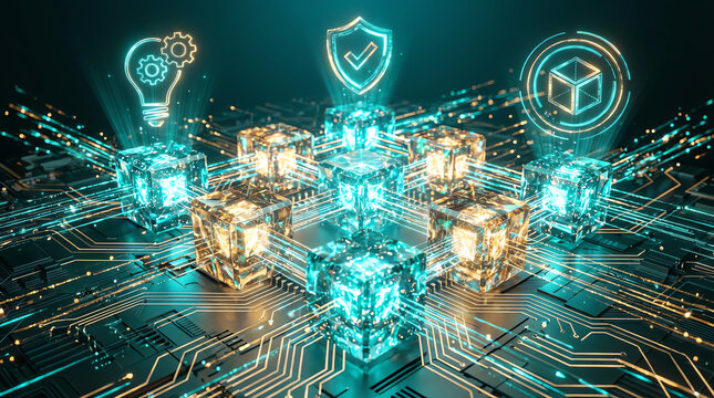 Futuristic blockchain network visualization with glowing cubes connected by circuits, featuring digital icons representing innovation, security, and 3D technology on a dark tech background