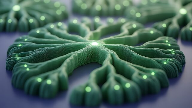 Close-up digital visualization of glowing neural cells with interconnected branches transmitting signals in a dynamic biological network