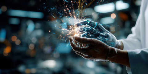 Right hand glowing with neural circuits and filament sparks for futuristic tech interface