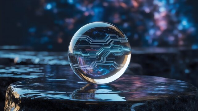 Crystal sphere with glowing neural circuits on stone surface – Great for artificial intelligence, data, or technology branding