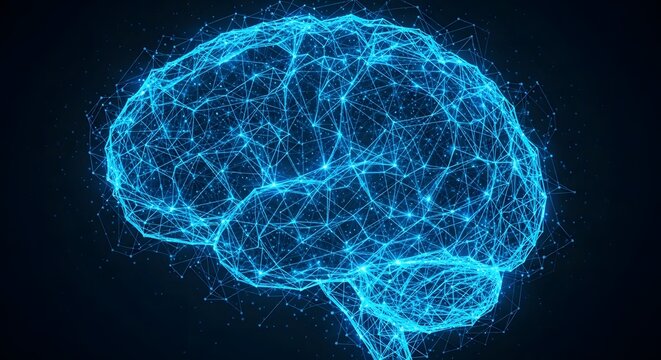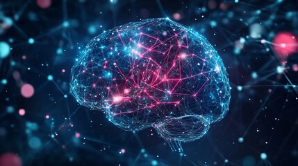 Futuristic 3d brain in digitalgrid with glowing neural mesh