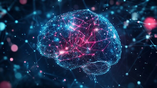 Glowing ai brain hologram pulsing with neural network connections in cosmic background