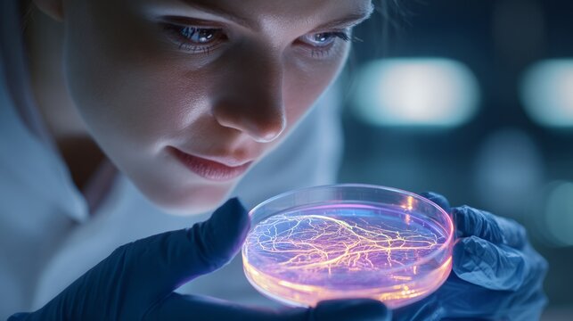 Young scientist examining a glowing neural interface hologram in a dark futuristic lab setting.