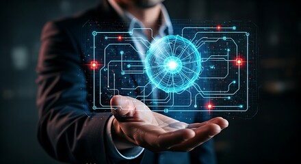 Man holding A I brain hologram in office setting black shirt
