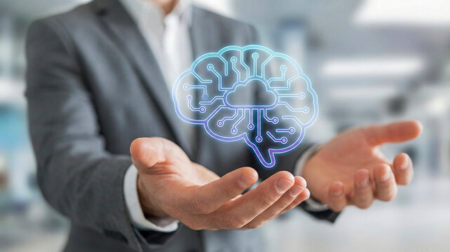 Ai automation high level planning concept with digital brain hologram and business professional in office focusing on innovation and strategy