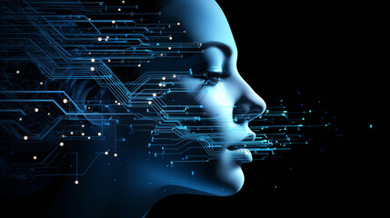 Female face with matrix digital numbers dots links hologram. Concept artificial intelligence AI with human face. Digital head shows cybernetic neural network. Futuristic tech art concept.