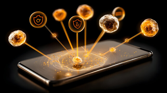Glowing neural network core emitting golden filaments across dark digital mesh with sparkling nodes