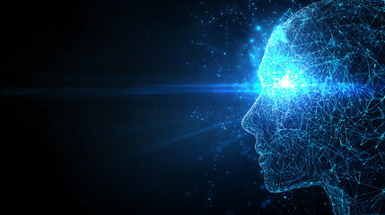 Digital human head with glowing neural network and blue light effects in a dark space background