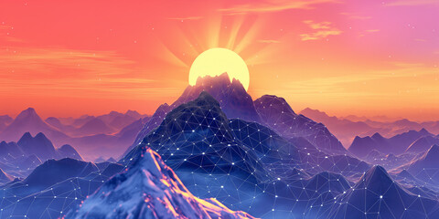 Ethereal Sunset: Surreal Mountain Landscape with Neural Network Sky Gradient - Psychedelic Abstract Background