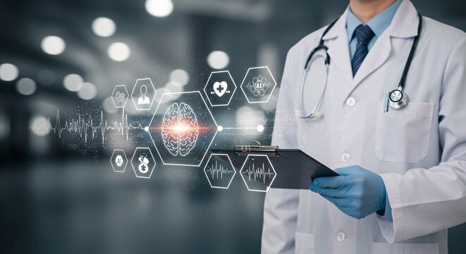 neurotechnology, futuristic brain treatment, neural interface, advanced neuroscience, brain scan diagnostics, digital neuro system, doctor with brain hologram, cognitive medicine,