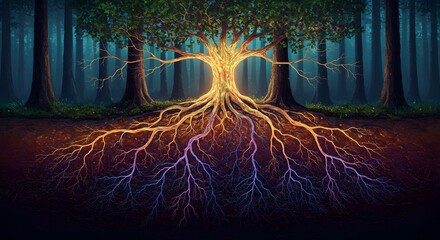 Intricate underground root systems form a vast, glowing neural network, connecting pulsing, colorful tree tendrils to a central mother tree as an organic data network