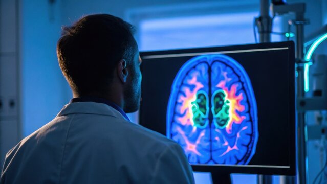 A medical professional analyzes a colorful brain scan on a monitor, highlighting neurological activity in a clinical setting.