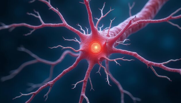 Glowing neural cell with dendritic projections in futuristic sci-fi style