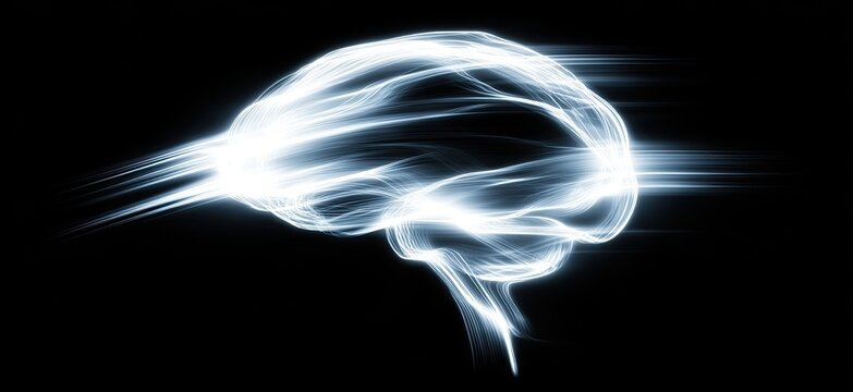 Abstract illustration of a brain, light blue lines and streaks against black background