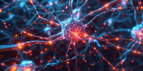 Futuristic glowing neuron illustration with electric pulses on dark background