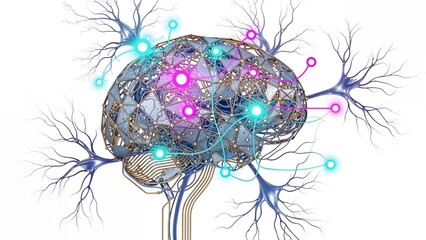 Artistic representation of the human brain, pathways, and colorful biological elements. Featuring blue brain structure and streams of colored shapes