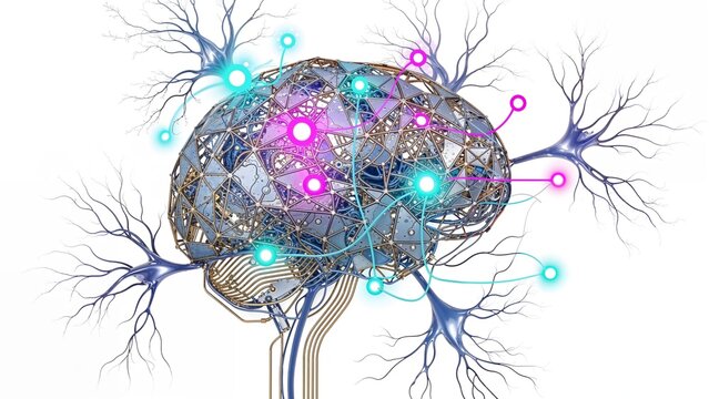 Networked brain with dashboard graphics represents neural connections and processing data