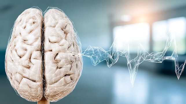 Futuristic digital brain with glowing wireframe and data visualization