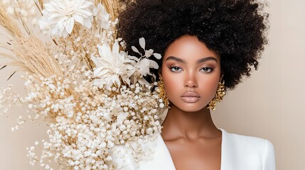 Elegant female model in blazer with sequins and jewelry, standing studio pose