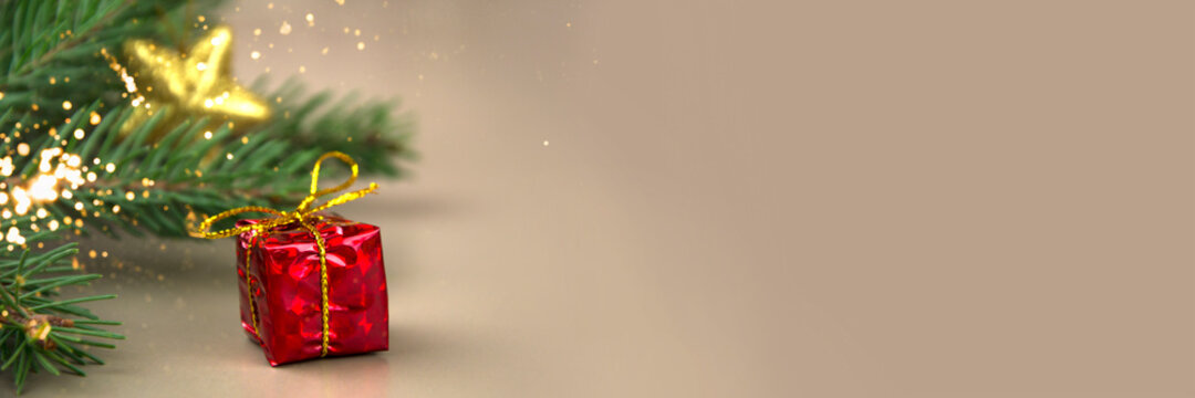 A gift on the background of a fir branch