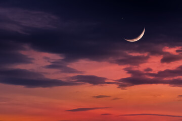 Ramadan Night with Crescent moon on dark blue sky background, Dramatic Sunset with Twilight dusk sky,Islamic religion for Ramadan Kareem,Eid al Adha, Eid Mubarak, Eid al fitr,New Year Muharram