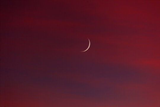 The romantic moon over water. Crescent moon with beautiful sunset background. New moon.
