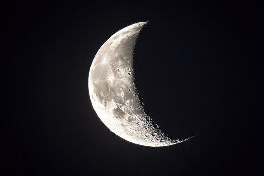 increasing sickle-shaped quarter moon with its moon craters stands in the black night sky