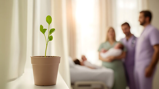 A potted plant symbolizes new beginnings against the backdrop of a hospital room, where a new family welcomes their baby, representing hope and growth.