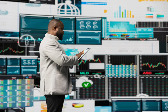 African american guy reflecting on annual financial reports for new development, reviewing the complexity of performance analysis with a focus on productivity and forecasting, AI tools.