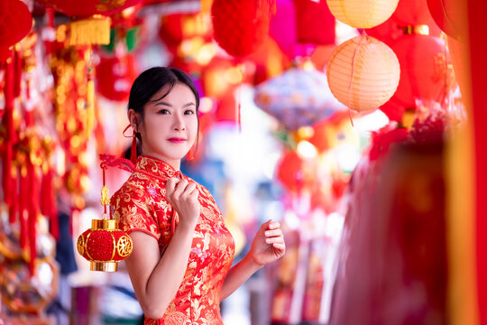 Asian woman in red cheongsam dress choosing and buying home decoration and ornament for celebrating Chinese Lunar New Year festival at market.Celebrate Chinese lunar new year.Celebrate season holiday.