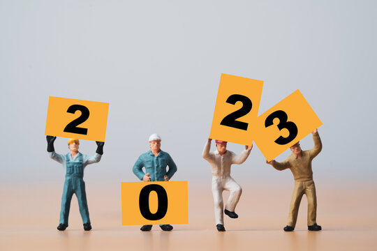 Miniature worker showing 2023 on yellow board for preparation merry Christmas and happy new year concept.