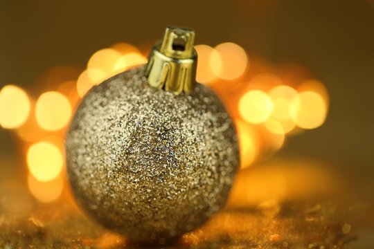 Christmas ball decor. Golden glitter ball on golden blurry bokeh background.Christmas and New Year winter festive background.Phone christmas wallpaper