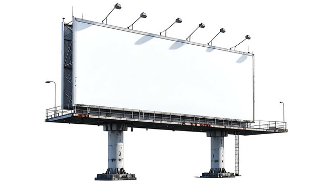 Large, blank billboard with overhead lights, on two concrete support columns, against black