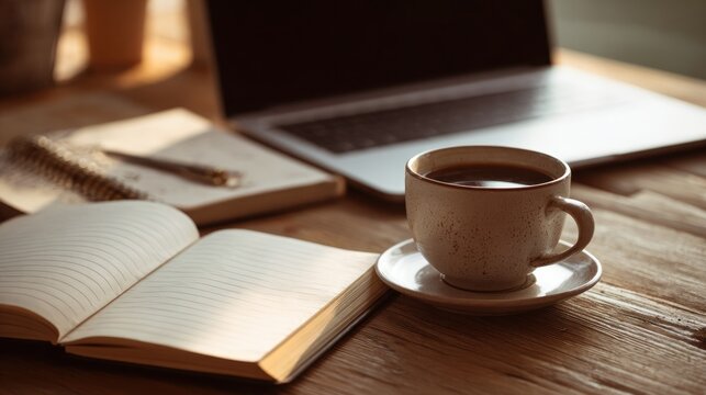 White notebook with Happy Womens Day text next to coffee cup and pink flowers