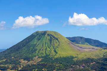 Mount Lokon volcano with Tompaluan active crater on the saddle between next door Mount Empung, near Tomohon city, Gunung Lokon, Tomohon, North Sulawesi, Indonesia