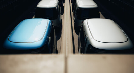 A line of futuristic-looking autonomous vehicles, lined up in a row, embodying technological advancements in transportation, sleek design, and urban mobility.