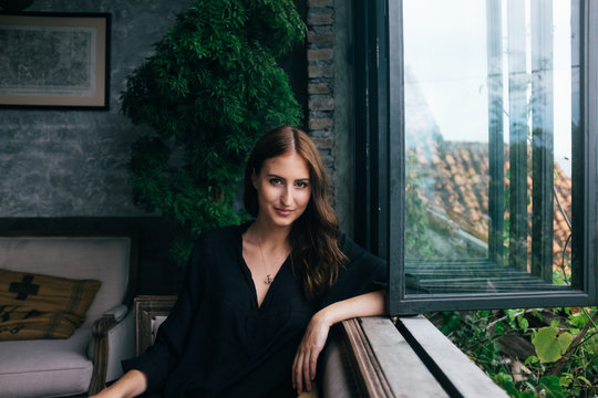 Sunlit rust wingback chair in reading nook with floor-to-ceiling windows and green view