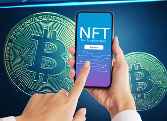 Hand holdding smartphone NFT blockchain on bitcoin cryptographic background marketplace,Cryptoart concept