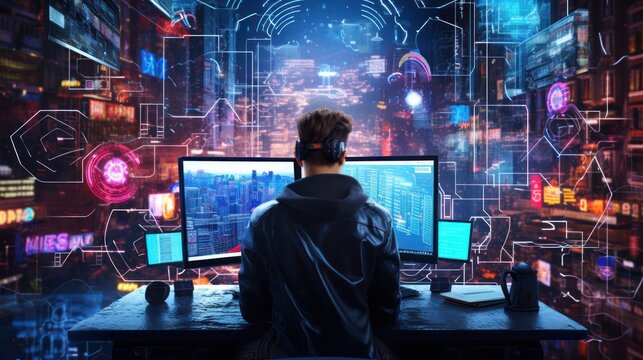 Craft a scene featuring a proficient hacker in a cyberpunk world, encircled by holographic interfaces, complex code, and elements of virtual reality