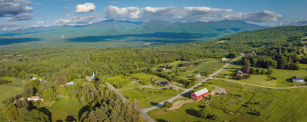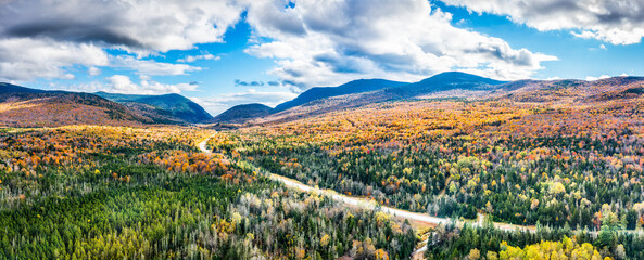 Aerial panorama US route 302 leading to Crawford Notch State park between Mount Webster and Willard. Mt Jackson (left), Willey, Field and Tom (right) are visible in the back.