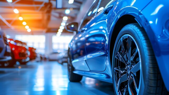 A blue car is parked in a showroom with other cars. The car is shiny and has a nice color
