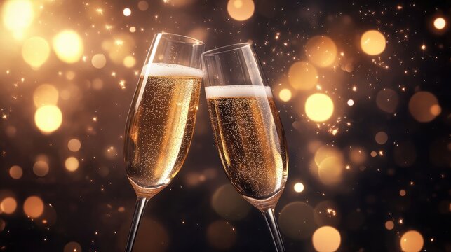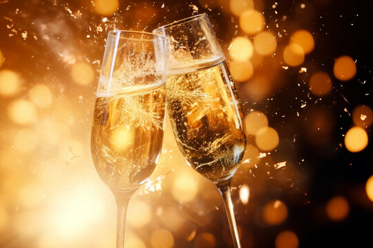 Two glasses of champagne toasting in the nigh with lights bokeh, glitter and sparks on the background