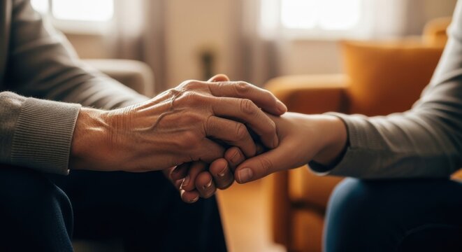 Close up of a wrinkled elderly hand gently holding a young adult hand, symbolizing care, support, and intergenerational connection