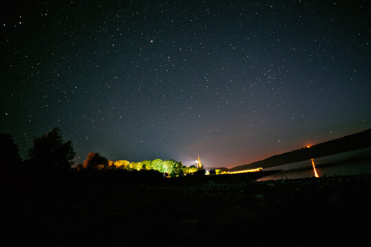 Group spectators stargazing in night sky lit by distant lights
