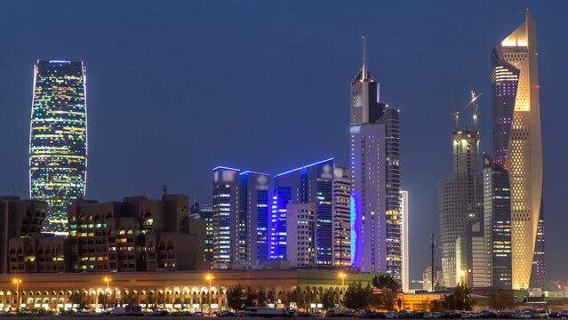 Financial graph overlay on city buildings at night