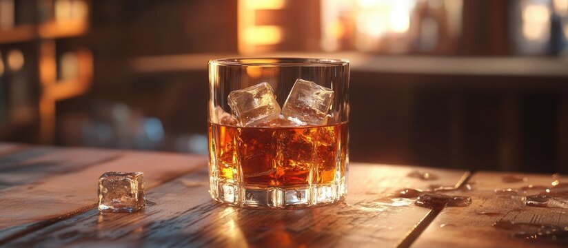 Glass of whiskey with ice cubes on a wooden surface. with copy space image. Place for adding text or design