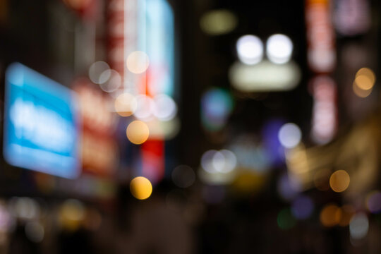 Blurred bokeh background of nightlife city with crowd and billboard